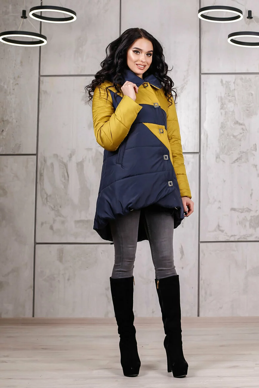 Куртка женская зимняя, выполнена из двух цветов плащевой ткани, утепленная тинсулейтом, прямого силуэта с расклешенной юбкой, выхваченной укороченной по низу полочек и заниженной по спинке, с втачными рукавами. Капюшон - не съемный.